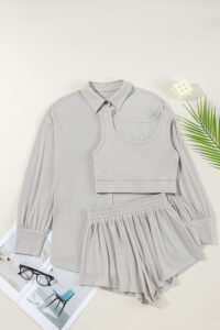 Gray 3 Pcs Crop Tank Top Shorts with Cardigan Lounge Set