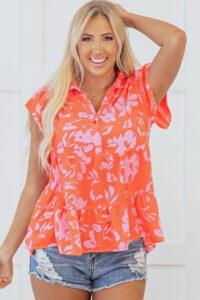 Orange Floral Print Collared Button Neckline Flutter Sleeve Blouse