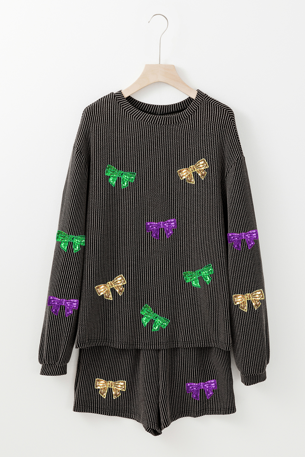 Carbon Grey Bowknot Patched Pattern Corded Long Sleeve Top and Shorts Outfit