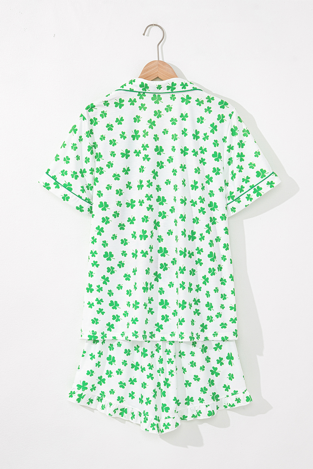 - The top is designed with short sleeves while the included shorts have ruffled edges.